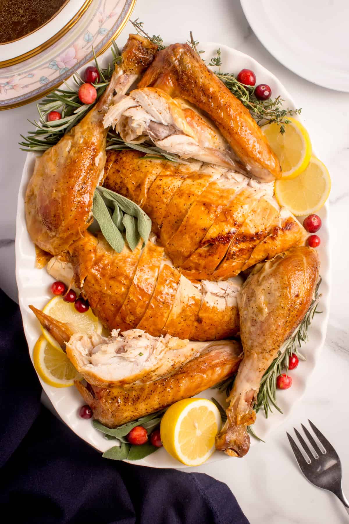 Plan for Leftovers & Gravy: Use the turkey drippings and roasted aromatics from the bottom of the roasting pan to make flavorful turkey gravy. Save leftover turkey in an airtight container.