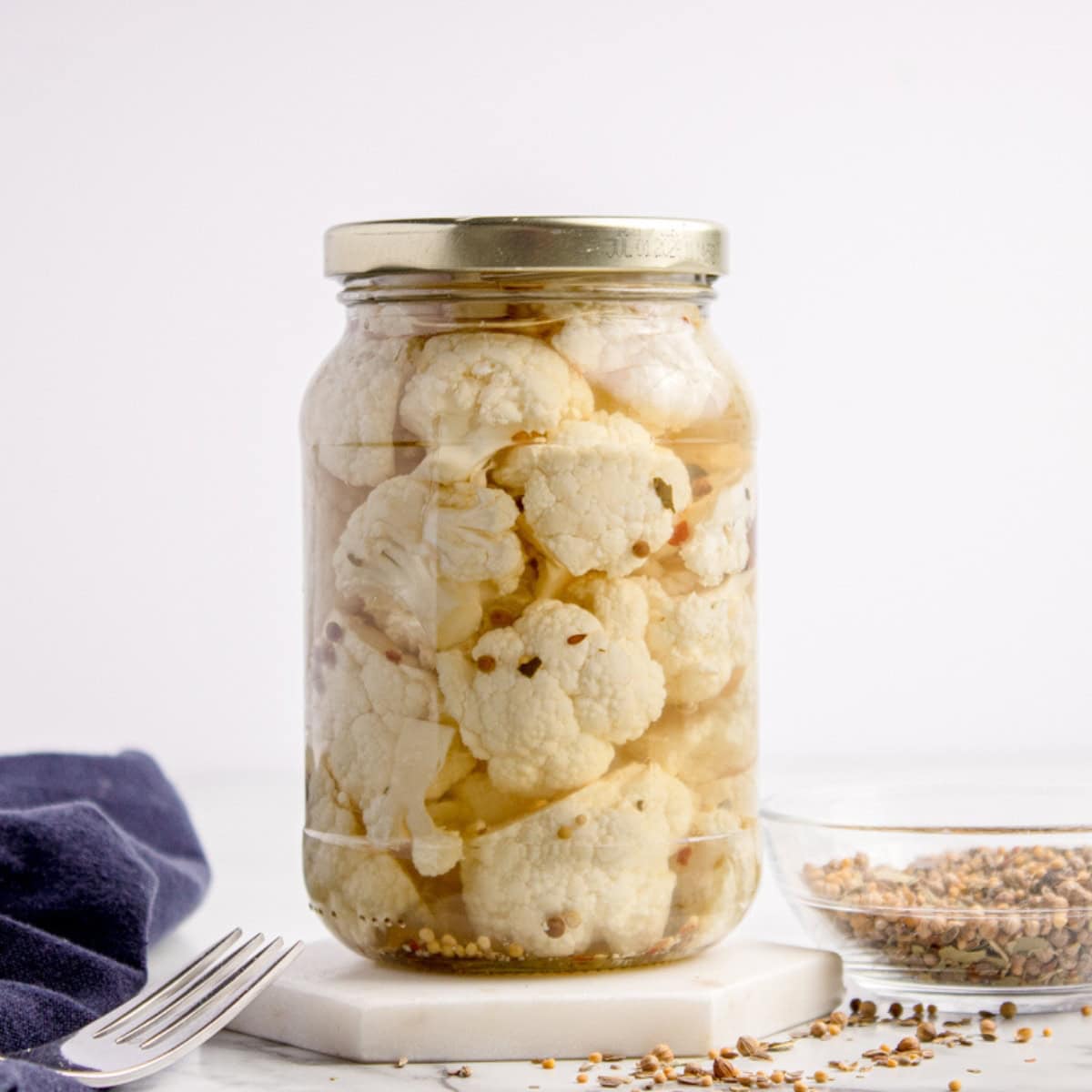 Carefully pour the hot liquid over the cauliflower. Use a butter knife or chopstick to release any trapped air bubbles. I recommend leaving ½ inch of headspace at the top.