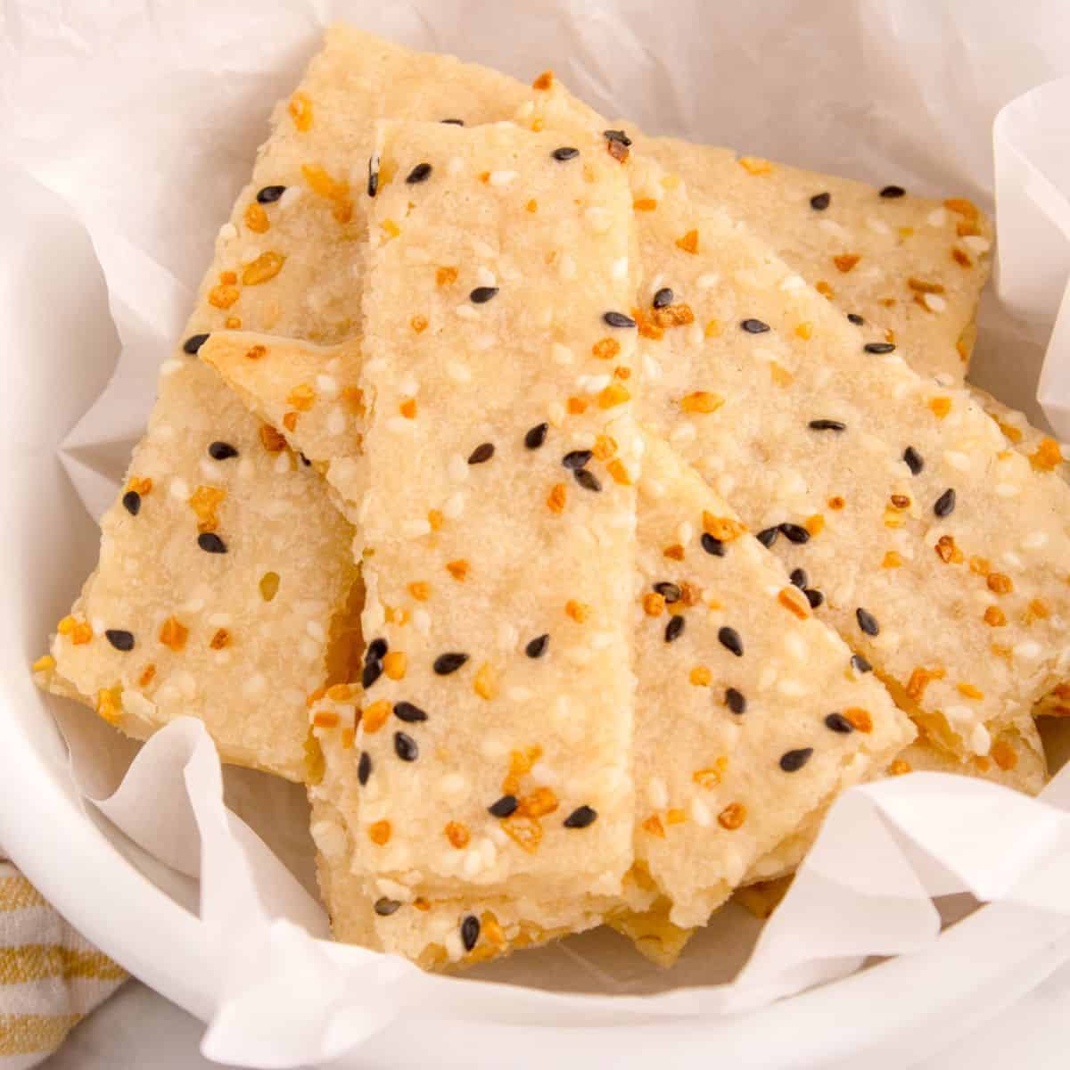 Butter: Adds richness and a flaky texture to the crackers. Feel free to use olive oil for a lighter, crispier texture with a subtle fruity note.Everything Bagel Seasoning: A mix of sesame seeds, poppy seeds, dried garlic, dried onion, and coarse salt adds a savory crunch and bold flavor. You can substitute it with plain sesame seeds, poppy seeds, or coarse kosher salt.