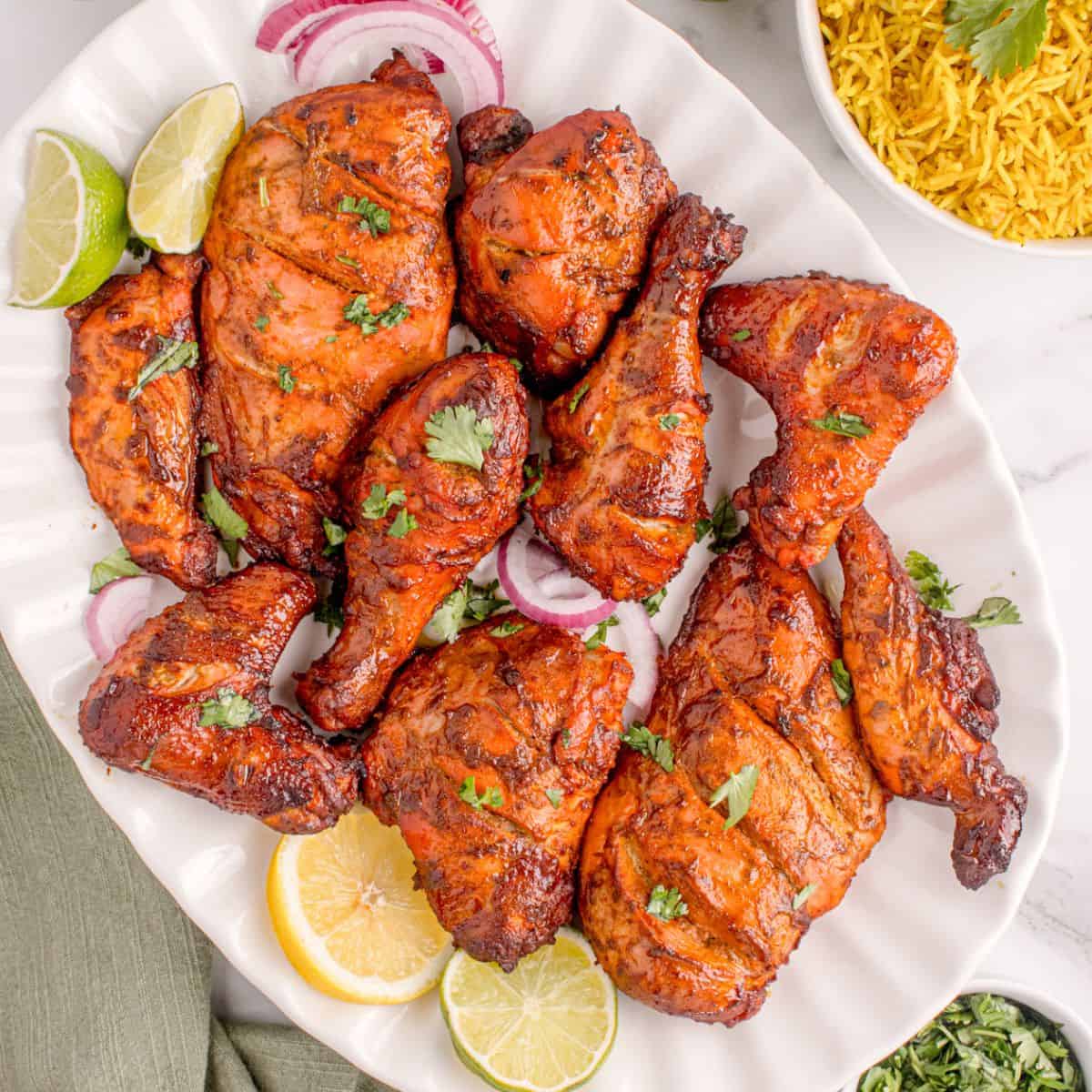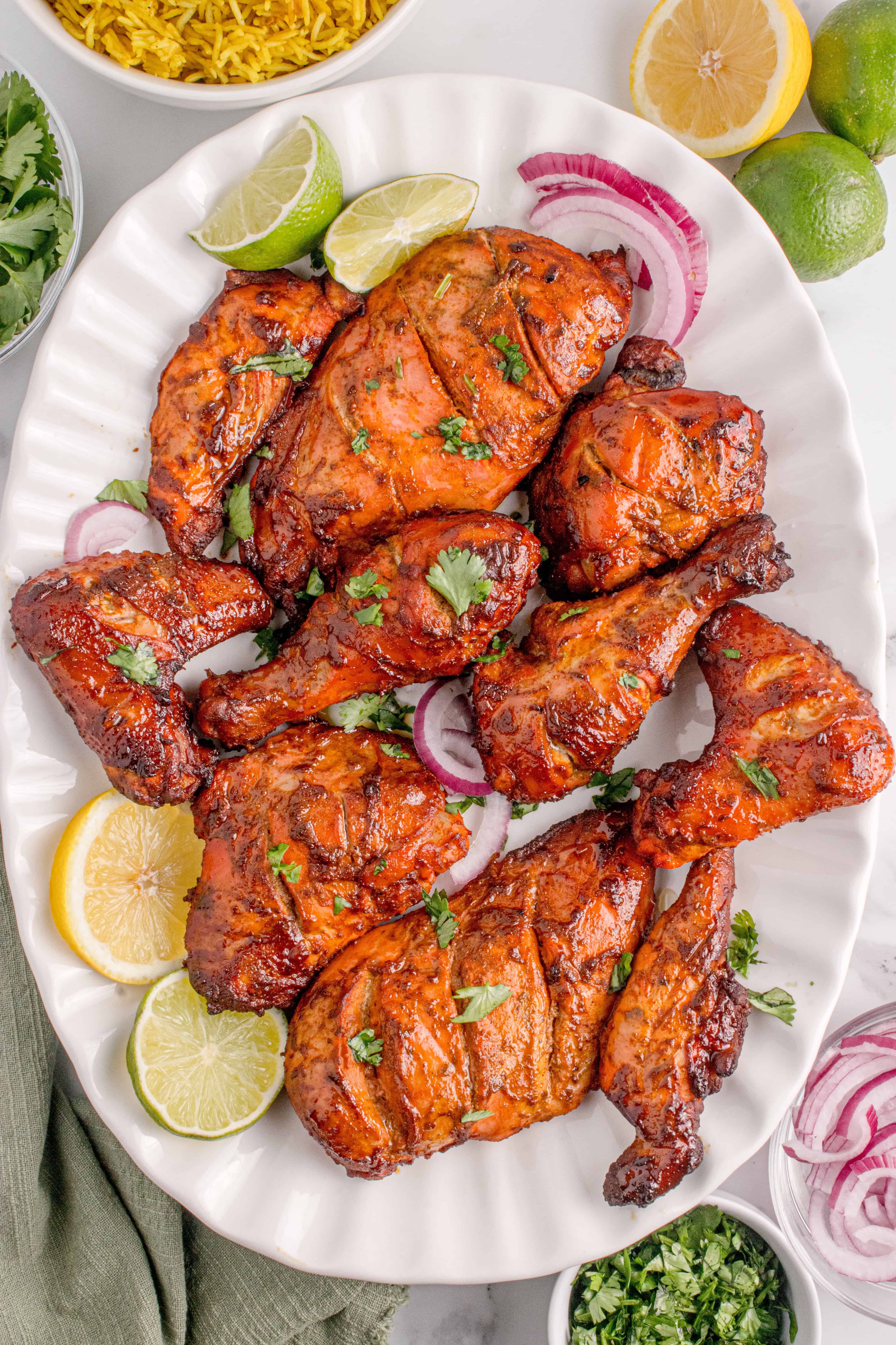 - Serve the grilled tandoori chicken with naan or basmati rice and garnish the dish with chopped cilantro and red onion slices.